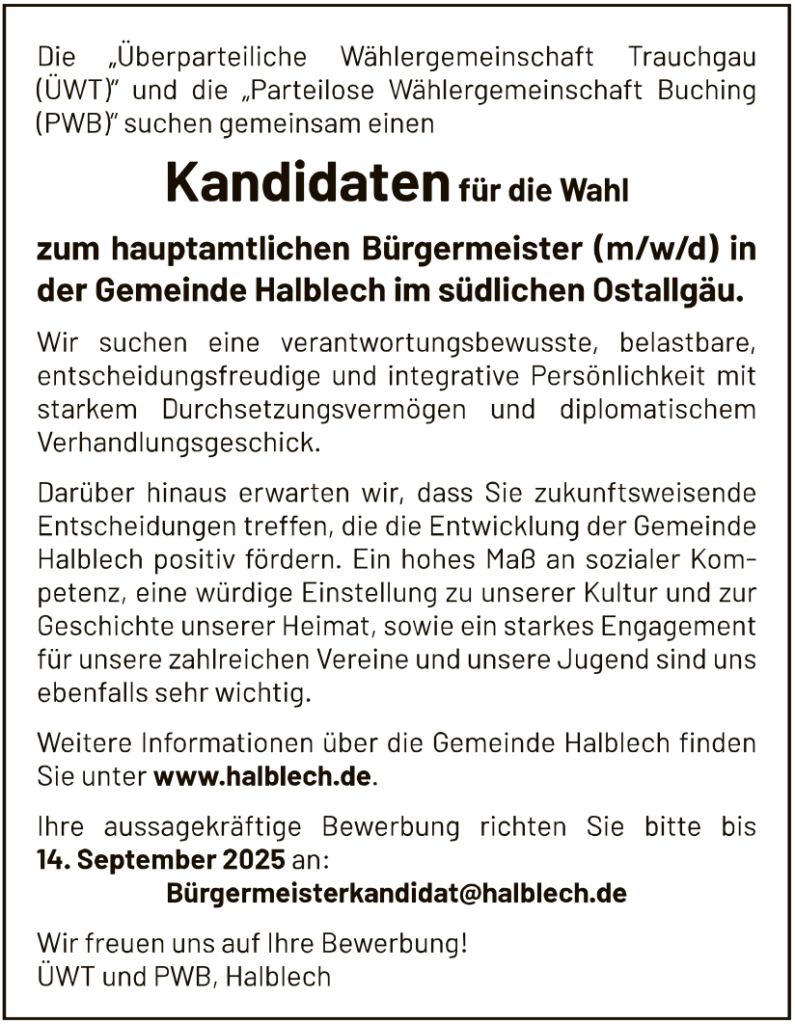 In der Bayerischen Staatszeitung vom 25. Juli 2025 stach mir die Ausschreibung zum Kandidaten für die Wahl zum hauptamtlichen Bürgermeister der Gemeinde Halblech ins Auge.